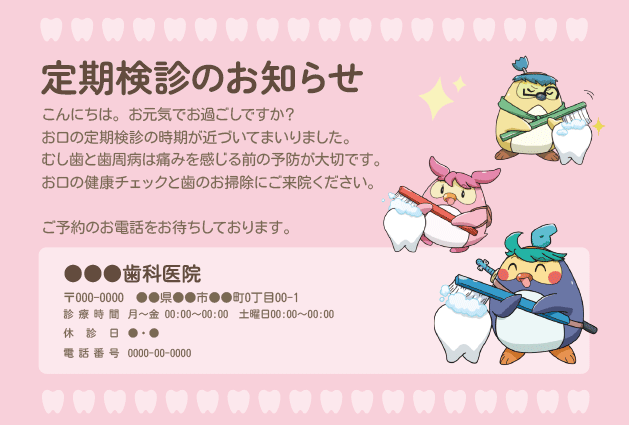 歯医者さんからのお知らせが楽しみになる。そんなサプライズを患者さんにお届けできるサービスです。定期健診のお知らせやバースデーカードなど、用件にあわせた多彩なハガキをご利用いただけます。