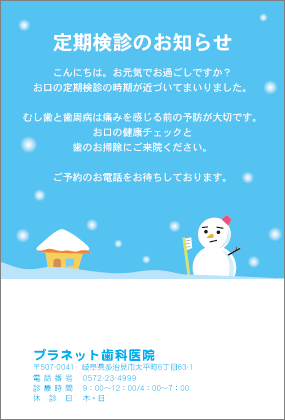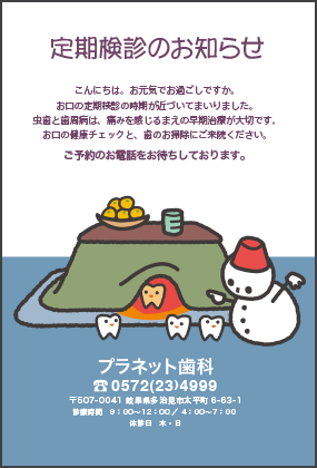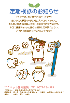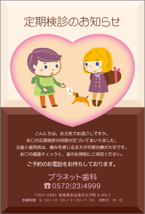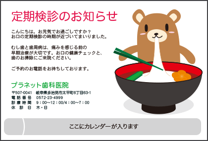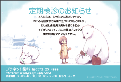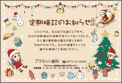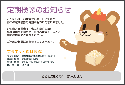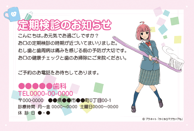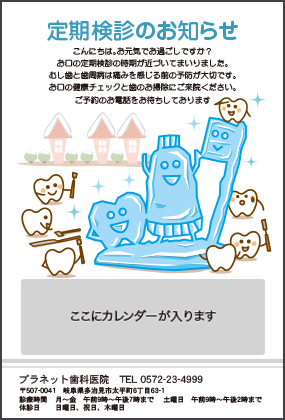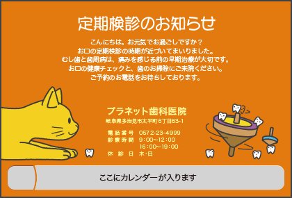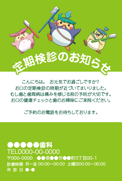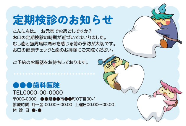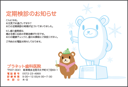 歯医者さんからのお知らせが楽しみになる。そんなサプライズを患者さんにお届けできるサービスです。定期健診のお知らせやバースデーカードなど、用件にあわせた多彩なハガキをご利用いただけます。