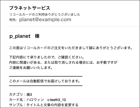 下記の画像は、カフェカードのオーダー直後に届く自動返信メールです。