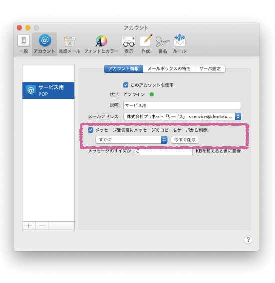 お使いのメールソフトで、サーバーのデータが消えるように設定してください。