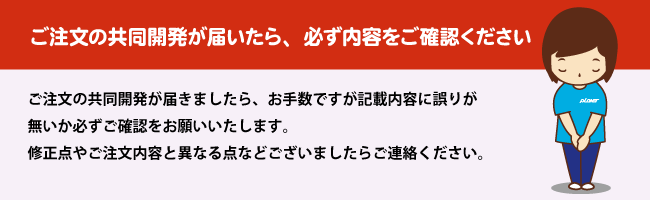 過去にオーダーいただいた共同開発資料のデータ保管につきましては、最終のオーダーから3年間とさせていただきます。あらかじめご了承ください。
